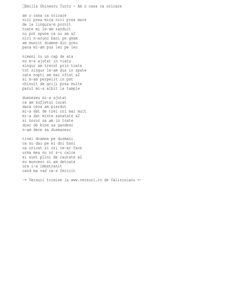 Am o casa ca oricare versuri. Abonati va pentru noutati. Am o casa ca oricare 1. Prin navigarea pe acest site va exprimati acordul asupra utilizarii cookie urilor. Am o casa ca oricare nici prea mica nici prea mare de la lingura m pornit toate mi le am randuit nu pot spune ca nu am x2 nici n arunc bani pe geam am muncit doamne din greu pana mi am pus leu pe leu nimeni cu un cap de ata nu m a ajutat in viata singur am trecut prin toate tot singur le am dus in spate cate nopti am mai oftat x2 si m am.