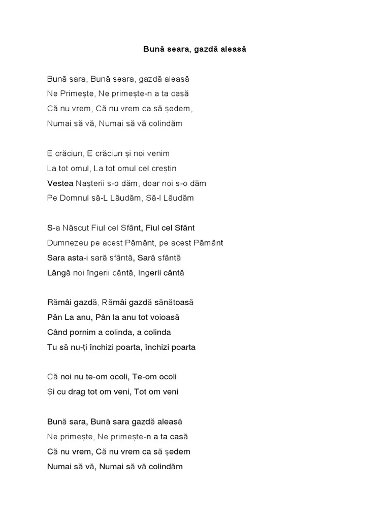 Buna seara gazda aleasa versuri. E craciun e craciun si noi venim la tot omul la tot omul cel crestin vestea nasterii s o dam doar noi s o dam pe domnul sa l laudam sa l laudam. Colinde versuri colinde din toate zonele tarii colinde traditionale colinde de craciun si anul nou plugusorul sorcova. Buna sara buna seara gazda aleasa ne primeste ne primeste n a ta casa ca nu vrem ca nu vrem ca sa sedem numai sa va numai sa va colindam e craciun e craciun si noi venim la tot omul la tot omul cel crestin vestea nasterii s o dam doar noi s o dam pe domnul sa l laudam sa l laudam s a nascut fiul cel sfant fiul cel sfant. Aceștia s au împiedicat și au căzut iar eu m am sculat și m am îndreptat.