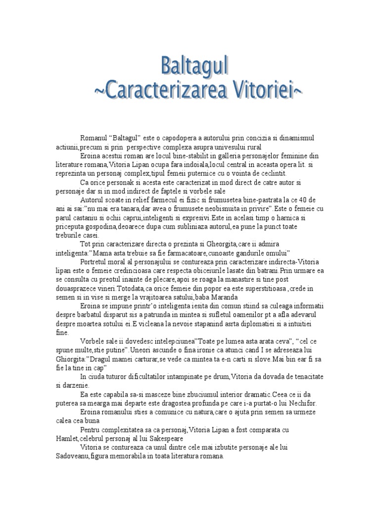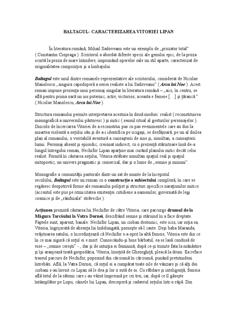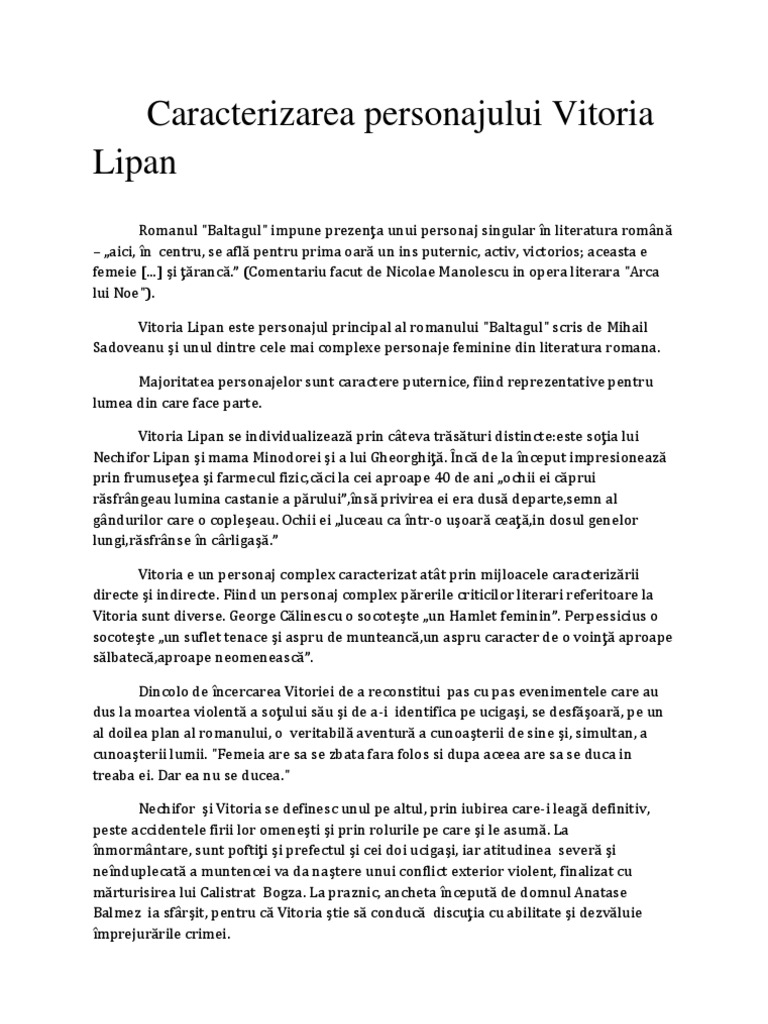 Caracterizarea lui vitoria lipan pe scurt. Caracterizarea directa a vitoriei lipan se realizeaza prin intermediul naratorului in special prin atitudinea sa pe care o are. Pe măsură ce are certitudinea morții lui lipan procesul ei de interiorizare se adâncește iar îndepărtarea de real se face simțită. Inainte de a porni in cautarea lui nechifor ea randuieste totul cu exactitate cu iscusinta il cheama pe gheorghita de la apa jijiei in pregateste un baltag pe care i l sfinteste preotul din sat o trimite pe minodora fata ei la o matusa care era calagarita la manastirea varatec pentru a o sti ferita de primejdii vinde unui negustor marfurile aflate acasa pentru a. Astfel pe lângă personaje principale.
