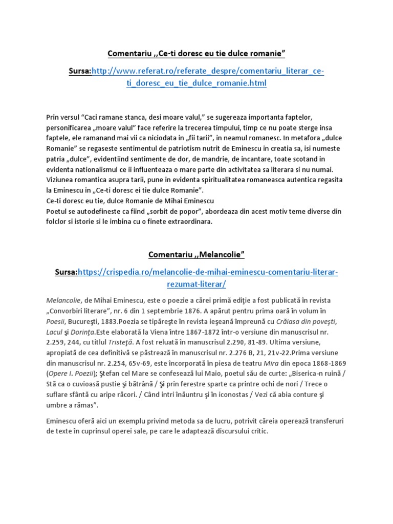 Dulce românie asta ţi o doresc. în textul original figura românia în loc de românie ce ți doresc eu ție dulce românia. Ce ti doresc eu tie dulce romanie de mihai eminescu prin versul caci ramane stanca desi moare valul se sugereaza importanta faptelor personificarea moare valul face referire la trecerea timpului timp ce nu poate sterge insa faptele ele ramanand mai vii ca niciodata in fii tarii in neamul romanesc. și eu născut în sânul arcadiei dar mie o scurtă primăvară dureri numai mi a dat.