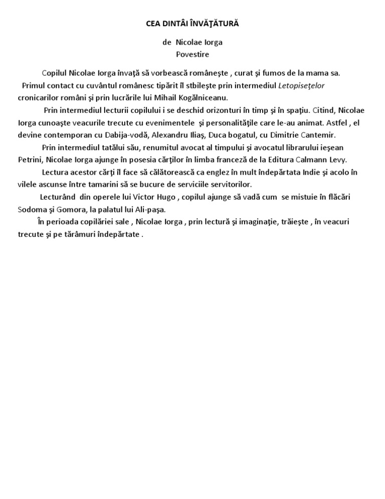 Cea dintai invatatura de nicolae iorga. 0 stele 0 review uri. Posted in învăţământ liceal limba şi literatura român. în acest scop relatarea întâmplărilor se face la persoana i memorialistul reuşind să reînvie un întreg univers real deşi. 0 stele 0 review uri.