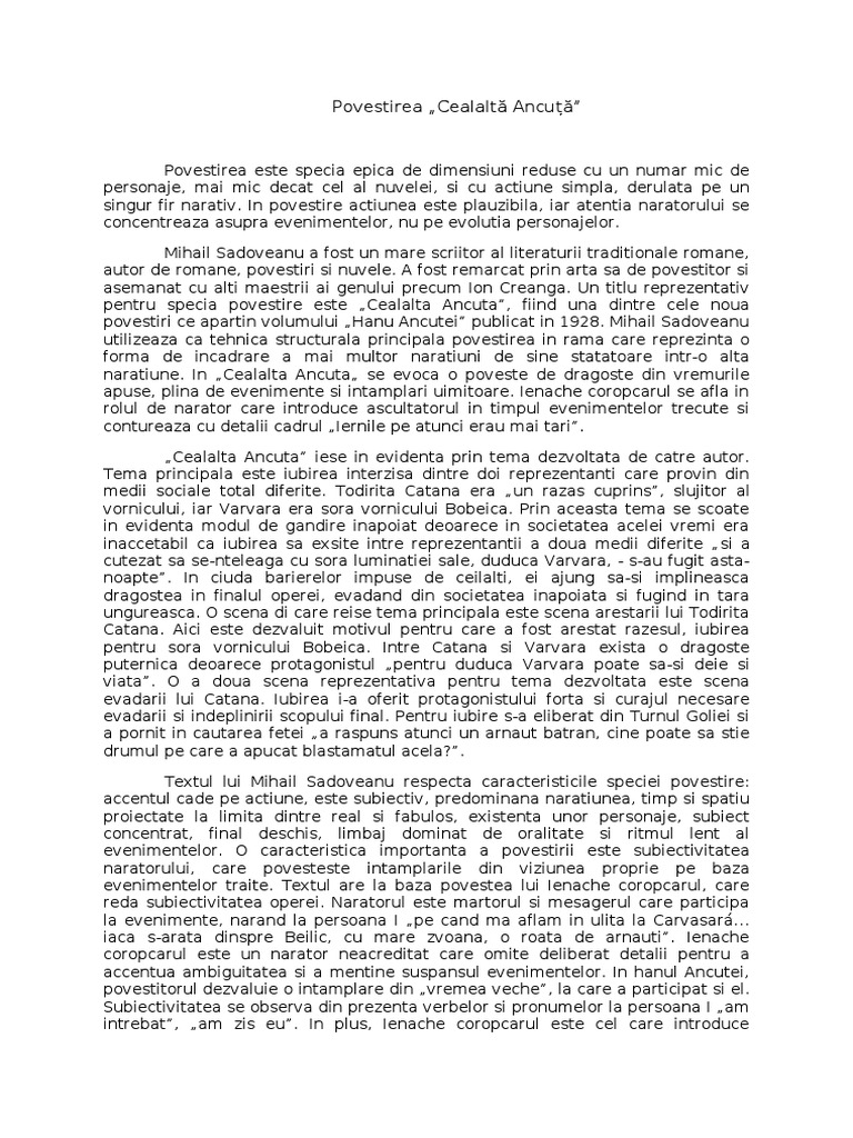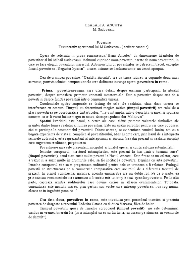 Cealalta ancuta tema si viziunea despre lume. Hasanache este tipul batranului profitor si uneltitor iar cealalta ancuta are atributele bunei gazde la fel ca si cea din prezent o continuare fireasca a mamei sale. Baltagul de mihail sadoveanu. Tema si viziunea despre lume in hanul ancutei. Basmul este o naratiune deliberat fantastica definita ca specie a genului epic din literatura populara sau culta care prezinta confruntarea dintre doua categorii opuse binele si raul simbolizate prin personaje pozitive si negative.