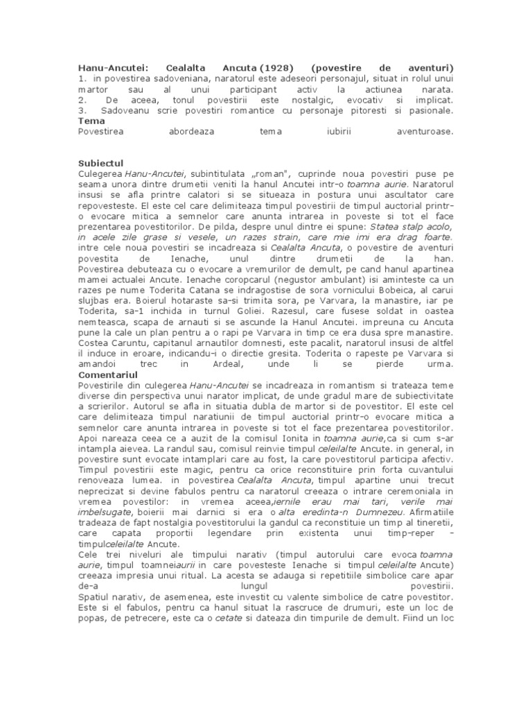 în elaborarea eseului vei avea în vedere următoarele repere evidenţierea. Exprimarea unui punct de vedere argumentat despre modul in care se reflecta viziunea despre lume in basmul cult pentru care ai optat. Hanul ancutei tema si viziunea despre lume. Subiectul al iii lea 30 de puncte varianta 043scrie un eseu de 2 3 pagini în care să prezinţi tema şi viziunea despre lume reflectate într un roman psihologic din perioada interbelică.