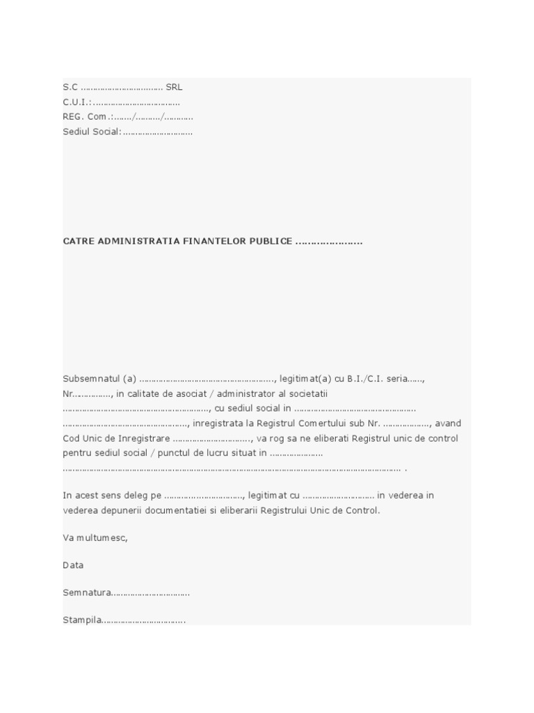 Cerere Registru Unic De Control 2020