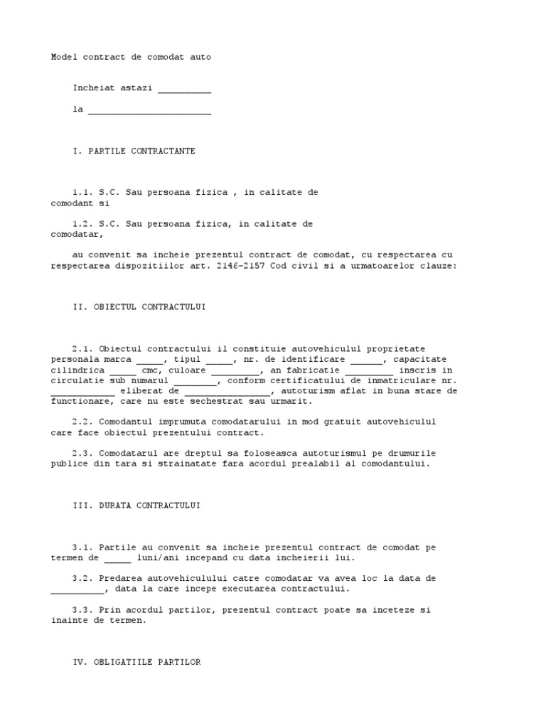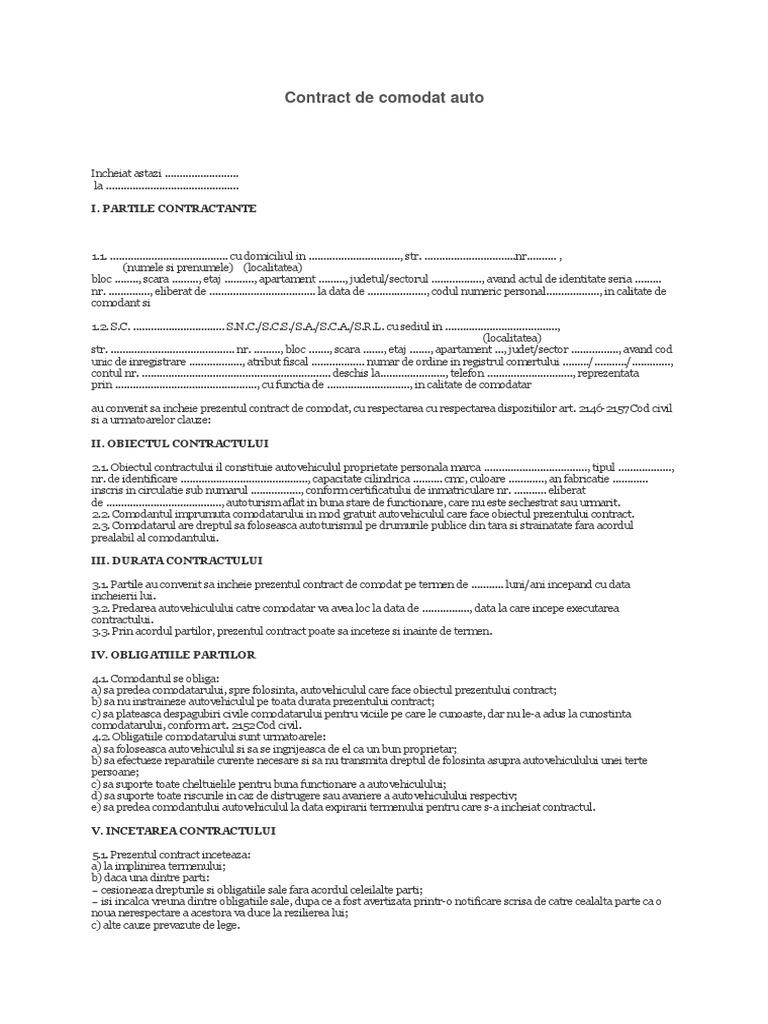 Model contract de comodat. Contractul de comodat auto este reglementat sub denumirea de împrumut de folosință în articolul art. Votati articolul contract de comodat auto actualizat 2020. Contract de comodat auto actualizat numit si contract de imprumut de folosinta retinem ca prevederile legale referitoare la contractul de comodat se regasesc la art.