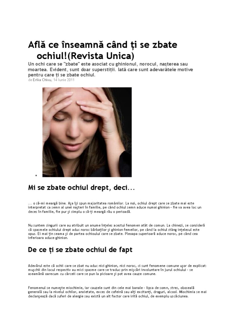 De ce ţi se zbate ochiul de fapt. în cazul acesta mai mult ca sigur ai auzit și tu vorbele din popor care spun că vei primi vești bune sau proaste. Oricum ar fi tot potrivit traditiei populare romanesti tine minte și ce descantec sa spui in gand cand ti se zbate ochiul. Si la chinezi un ochi care se zbate are o serie de intelesuri.
