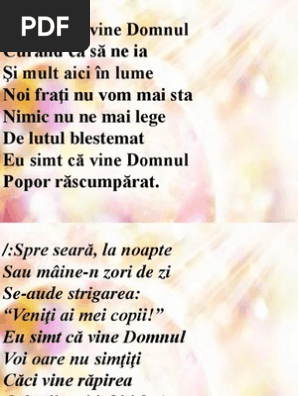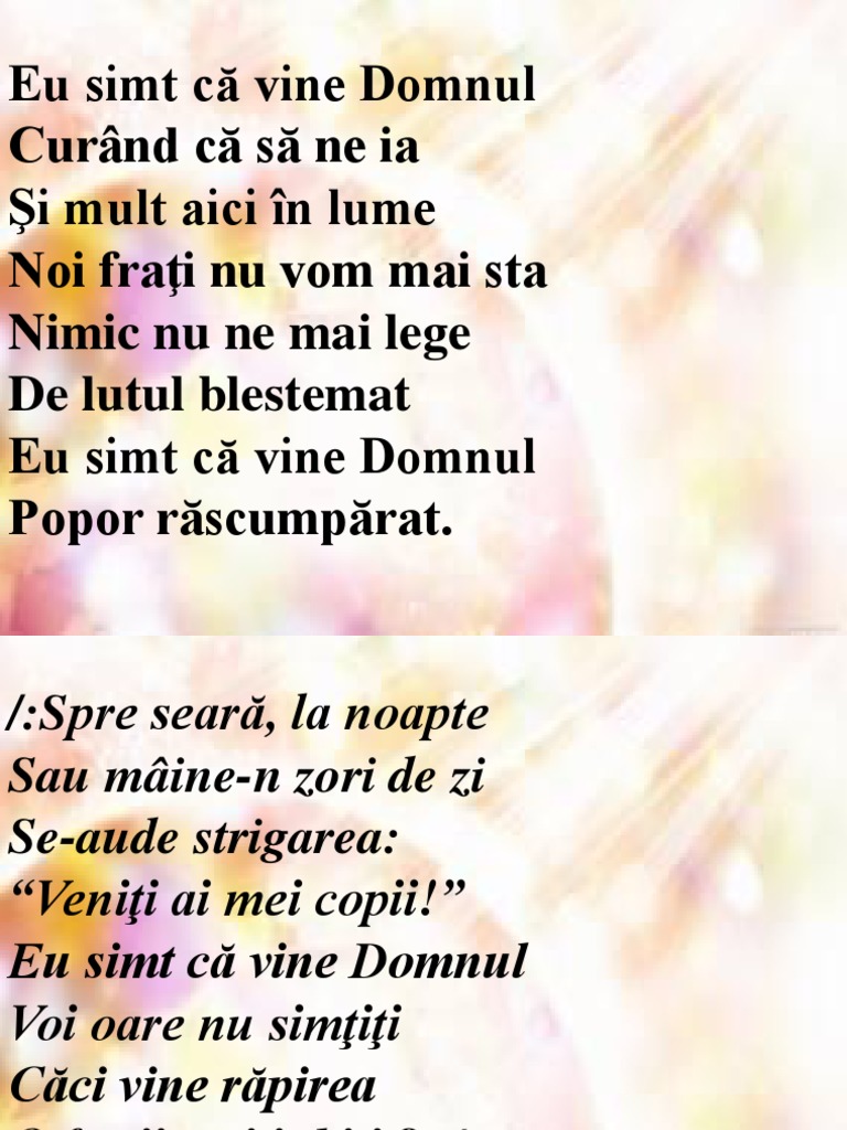Eu simt ca vine domnul. Eu simt că vine domnul curând că să ne ia şi mult aici în lume noi fraţi nu vom mai sta nimic nu ne mai lege de lutul blestemat eu simt că vine domnul popor răscumpărat. Spre seară la noapte sau mâine n zori de zi se aude strigarea. 4 1k views july 22. şi cine crede în mine nu va înseta niciodată.