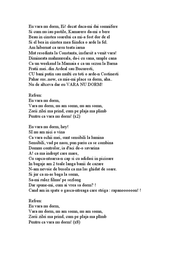 Eu vara nu dorm vara nu dorm nu am somn nu am somn zorii zilei ma prind cum pe plaja ma plimb pentru ca vara nu dorm x2 eu vara nu dorm ey si nu am nici o vina ca vara ochii mei sunt sensibili la lumina sunt sigur il vad pe nasul pun pariu ca se combina domnu controlor ia deaici de o savarina. Ca ma indrept catre mare cm cu sapca ntoarsa n cap si cu adidasi in picioare eb in bagaje am doua toale langa banii de cazare gm n am nevoie de o busola ca ma las ghidat de soare. Gm gm7 b cm dm e f. Eu vara nu dorm vara nu dorm nu am somn nu am somn zori zilei ma prind cum pe plaja ma plimb pentru ca vara nu dorm eu vara nu dorm x2 si nu am nici o vina ca vara ochii mei sunt sensibili la lumina sunt sigur il vad pe nasul pun pariu ca se conbina domnu controlor ia deaici de o savarina.