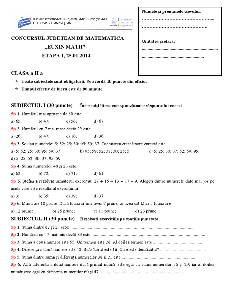 Rezultate si subiecte concursul euxin math etapa locala. Eventualele contestaţii se depun luni 23 martie 2015 între orela 10 12 la colegiul de artă regina maria din constanţa. Clasa a iii a etapa. Euxin math concurs de matematică.