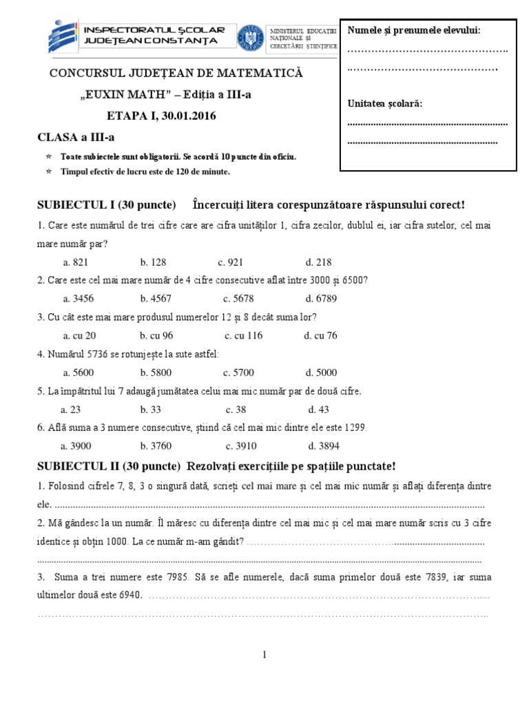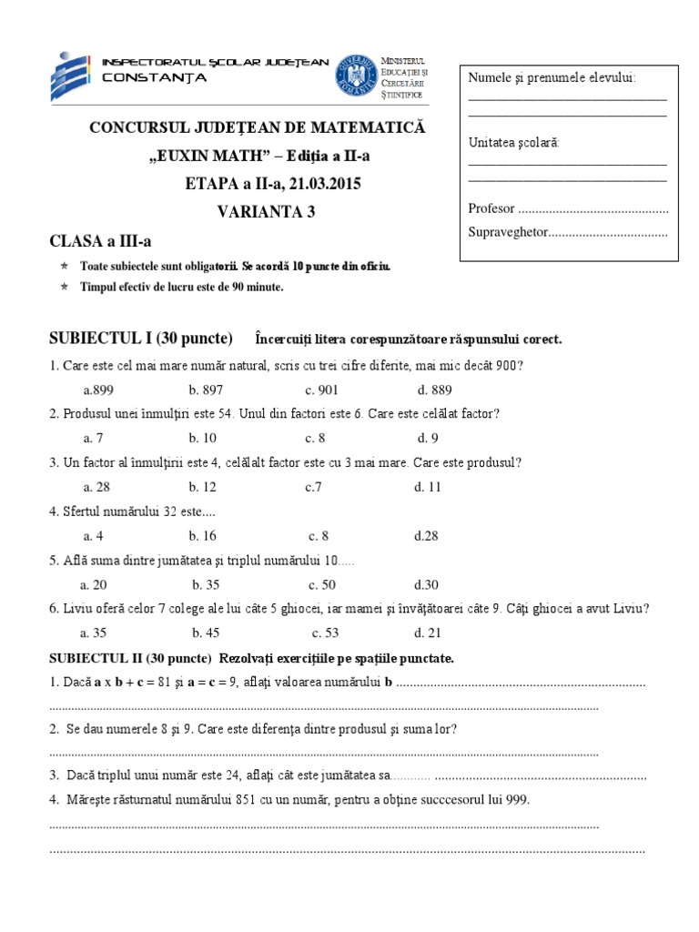 Euxinmath clasa 3 etapa pe scoala. Dacă continui să folosești acest site web ești de acord cu utilizarea lor. Luni 04 martie 2019 00 13. 16 m i dobrogianu constanța iv 100 gurgu nicoleta doina 3.