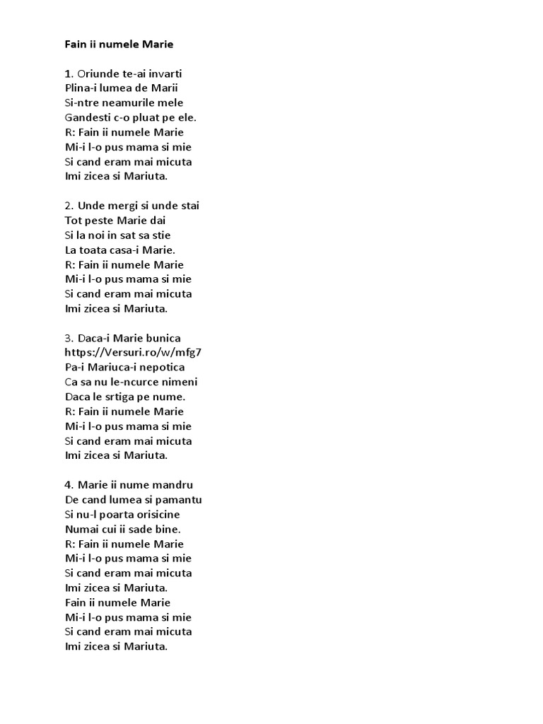 Olguta berbec versuri fain ii numele marie oriunde te ai invarti plina i lumea de marii si ntre neamurile mele gandesti c o pluat pe ele fain ii numele marie mi i l o pus mama si mie si cand eram olguta berbec fain ii numele marie lyrics. Vladuta lupau nu asara alaltasara. Fain ii numele marie mi i l o pus mama si mie si cand eram mai micuta imi zicea si mariuta. Vladuta lupau si daniel pop averea i chin si sfada.