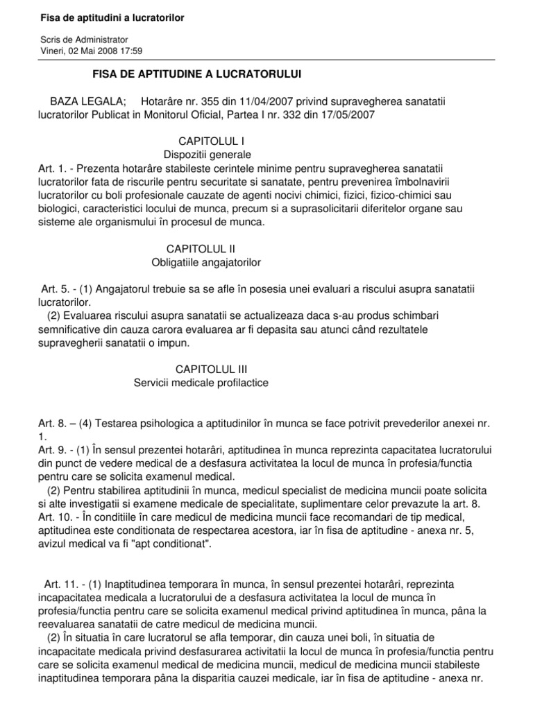 Medicina muncii fișa de aptitudine nr un exemplar se trimite la angajator unul se înmânează angajatului hotărâre 1169 2011. Persoana examinata urmeaza sa efectueze activitatea profesionala la un loc de munca ce prezinta riscurile profesionale detaliate în fisa de expunere la riscuri profesionale anexata prezentei cereri. 355 2007 privind supravegherea sănătății lucrătorilor cumpărați documentul în formă actualizată sau alegeți un abonament lege5 care. Se vor realiza in mod obligatoriu pentru toti lucratorii la un interval ce nu poate fi mai mare de 1 an in functie de istoricul lucratorului si de fisa de identificare a factorilor de risc profesional.