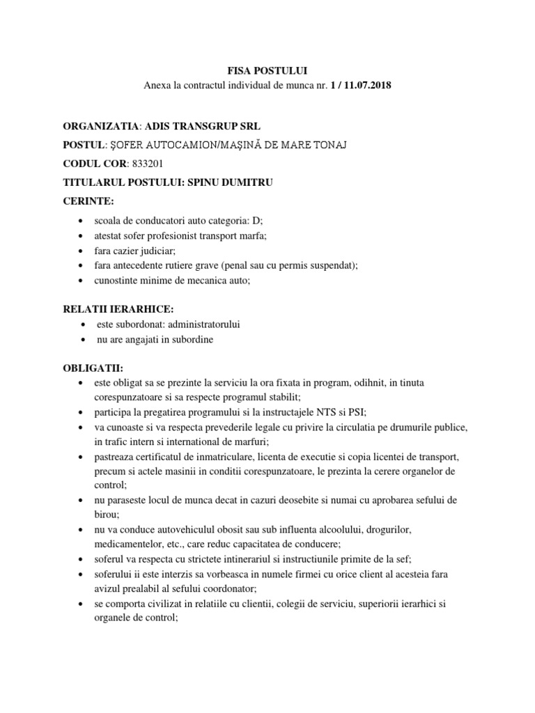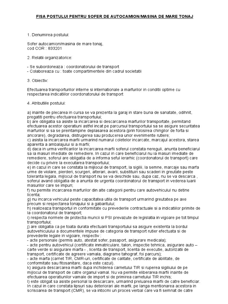Share fisa postului sofer de mare tonaj 833201. 833 201 sofer autocamion masina de mare tonaj. Numele si prenumele salariatului. Nume si prenume sef ierarhic 6.