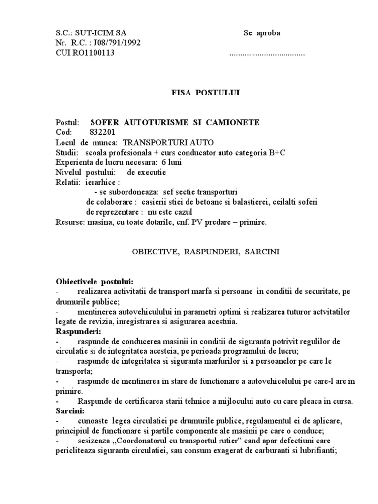 Fisa postului sofer autocamion de mare tonaj. Nume si prenume salariat 4. Fisa postului nume si prenume postul. Studii medii scoala. Pontaj sofer autocamion.