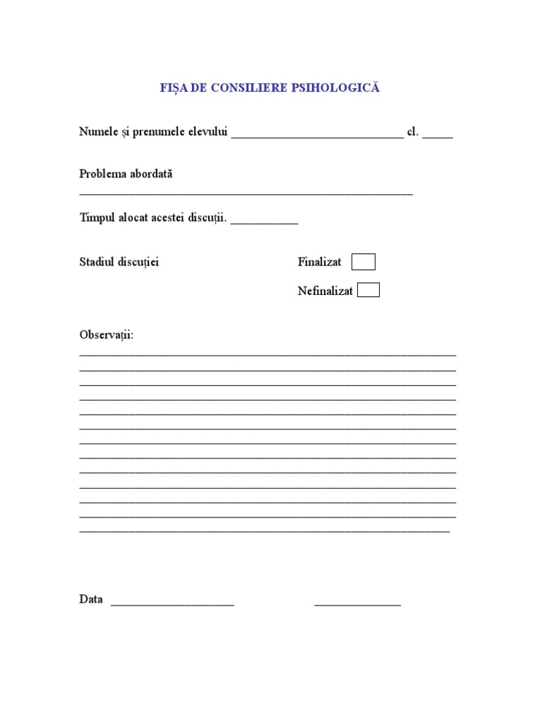 Termenul de valabilitate al fisei de evaluare psihologica nu poate fi mai mare de 3 luni. Fisa de anamneza psihologica 1. Cele mai interesante stiri despre fisa de lucru consiliere. Dacă continui să folosești acest site web ești de acord cu utilizarea lor.