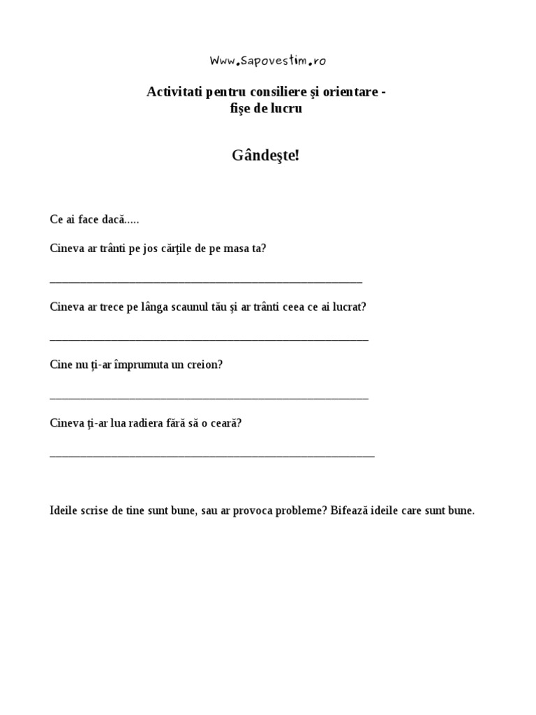 Fise de lucru consiliere psihologica. 9 au spus mulţumesc. In solutionarea problemelor copiilor supradotati foarte importanta este relatia parinti scoala. Caiet de lucru cu clientul in psihologia individuala tarzan1a. Fisa de lucru interesele mele.