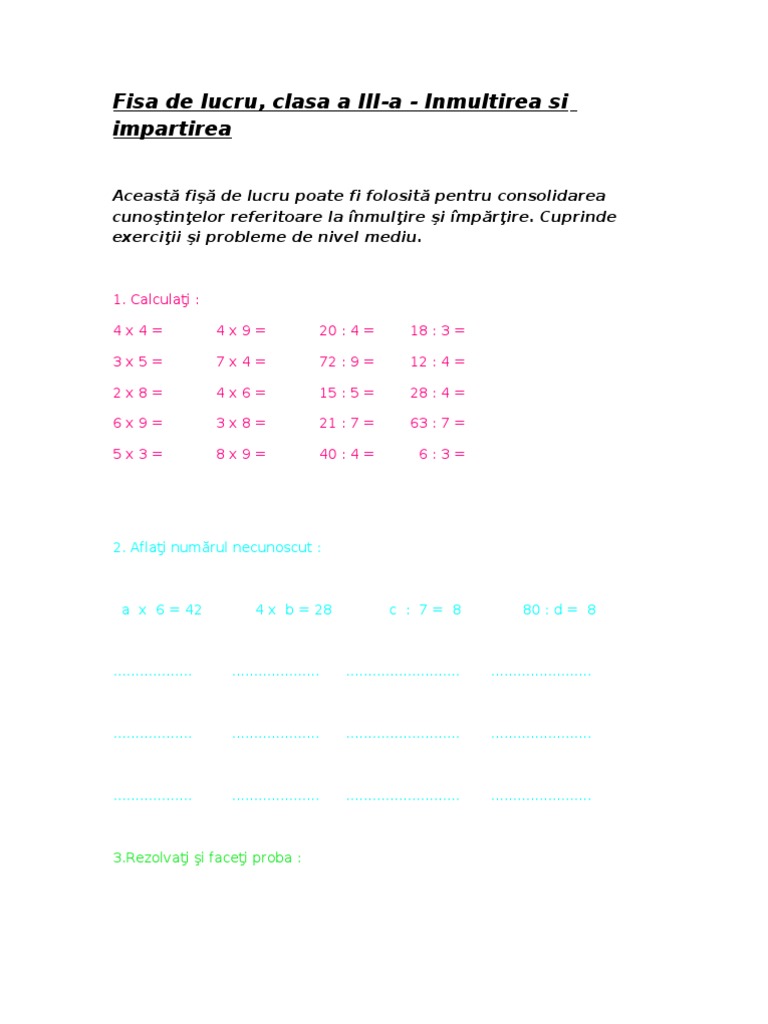 Fişe de lucru matematică clasa a 2 a. Inmultirea si impartirea numerelor naturale exercitii diverse. Fisa de munca independenta pentru consolidarea inmultirii si a impartirii clasa a ii a. Prima pagină învăţământ primar matematica fişe de lucru fişă de lucru înmulţirea clasa a ii a fişă de lucru înmulţirea clasa a ii a 11 iunie 2018 14 08.