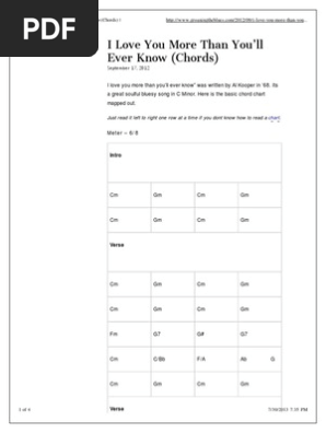 I love you more than you ll ever know lyrics and chords. Intro cm gm cm gm cm gm if i ever leave you baby you can say i told you so cm gm f m fm and if i ever hurt you you know i hurt myself as well g is that anyway for a man to carry on g g do you think i want my loved one gone cm bb said i love you f a g g more than you ll ever know cm gm cm gm more than you ll ever know cm gm when i wasn t making much money you know where my paycheck went cm. Ab g7 you d think he d want his little loved one gone cm cm bb adim ab g7 i love you baby more than you ll ever know more than you ll ever cm gm7 x2 know verse 2 cm gm7 when i wasn t makin too much money you know where my paycheck went you know i brought it home to baby and i never spent one red cent chorus fm7 g7 ab g7 cm cm bb adim ab. Slow 6 8 blues with a walkin bass line. While its probably best suited for guitar it sounds pretty good on a piano too.