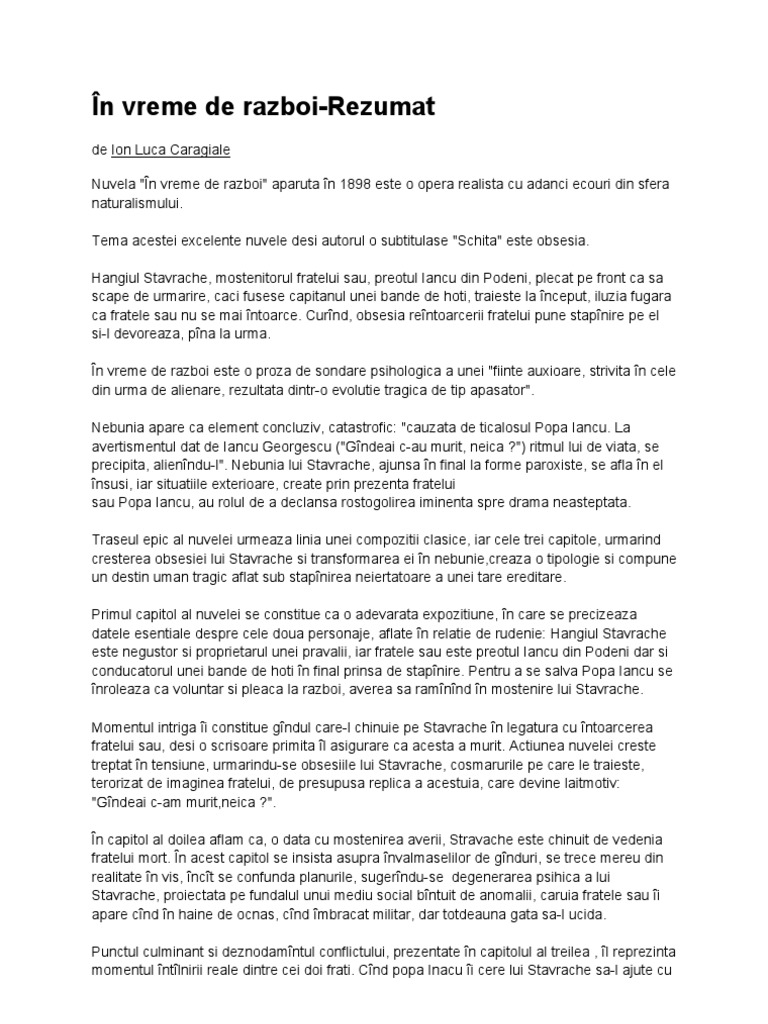 Ion luca caragiale in vreme de razboi rezumat alaturi de ioan slavici caragiale este in literatura noastra creatorul nuvelei realist psihologice. Deși aparent el se referă la perioada războiului de independență în realitate titlul simbolizează un război interior. Se aflau în vreme de război. Alături de ioan slavici ion luca caragiale este creatorul nuvelei realist psihologice deosebindu se de acesta nu numai prin tematica abordată ci mai ales prin capacitatea artistică de a insera în firul epic principiile estetice.