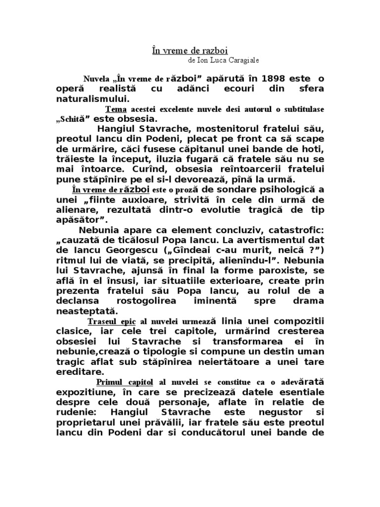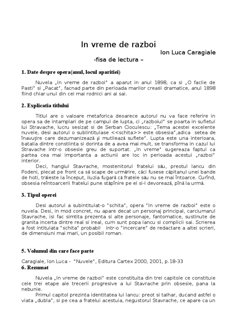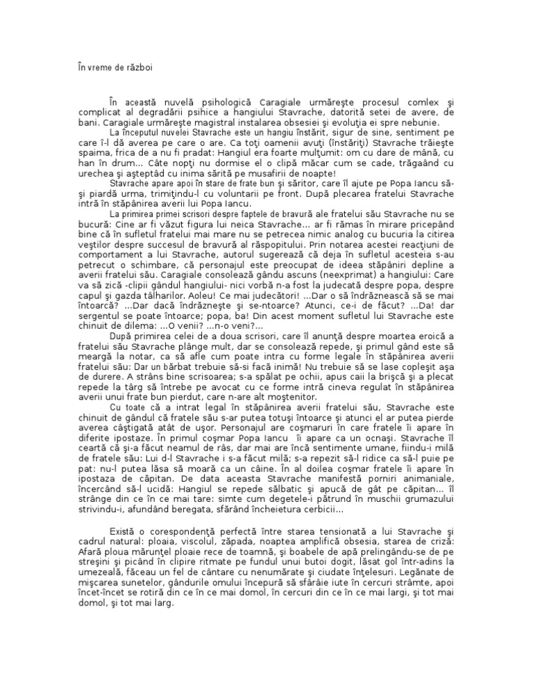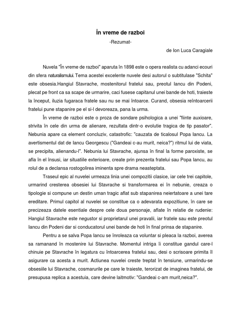 In vreme de razboi personaje. Stavrache si iancu sunt doua posibile masti umane reprezentand de fapt doi posibili invingatori invinsi e lovinescu. Neica stavrache îi hrăni bine le dădu de băut și loc unde să doarmă. Nuvela psihologica în vreme de război de ion luca caragiale nuvelă psihologică de factură naturalistă alături de ioan slavici ion luca caragiale este creatorul nuvelei realist psihologice nuvela în vreme de război de ion luca caragiale 1852 1912 a apărut în 1898 şi este o creaţie realist psihologică având şi puternice accente naturaliste. In vreme de razboi.