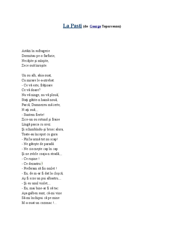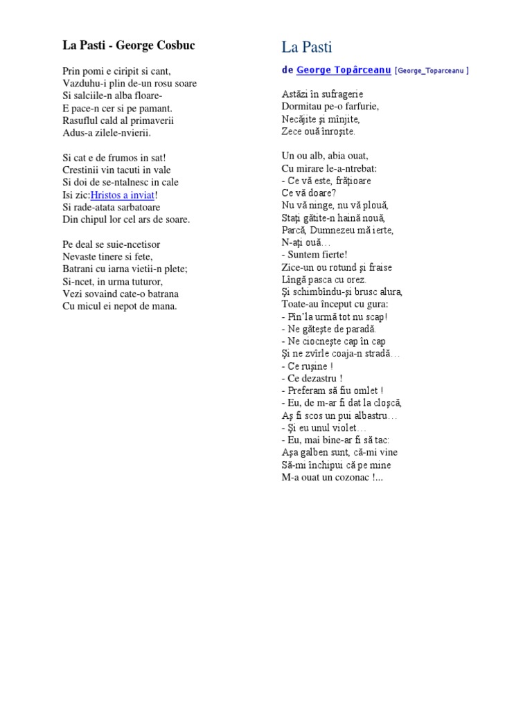 Versuri george coșbuc la pasti prin pomi e ciripit si cant vazduhu i plin de un rosu soare si salciile n alba floare e pace n cer si pe pamant. La pasti george cosbuc 5 00 5 din 1 voturi. Rasuflul cald al primaverii adus a zilele nvierii. şi ncet în urma tuturor vezi şovăind câte o bătrână cu micul ei nepot de mână.