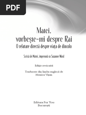 Matei vorbeste mi despre rai pdf. Da mi si mie darul acesta ca sa pot sa. Matei vorbeste mi despre rai o prezentare a raiului care îti va schimba viata. O serie de conversatii uimitoare si înduiosatoare între matthew si mama sa suzanne ward ne dezvaluie diferentele uriase dintre ceea ce ne i. 2 cele doua volume publicate la editura for you contin mesajul pe care doamna suzanne ward le a primit de la fiul ei matei care a murit de curand si care face o prezentare foarte detaliata a vietii de dupa moarte si a lumii de dincolo.