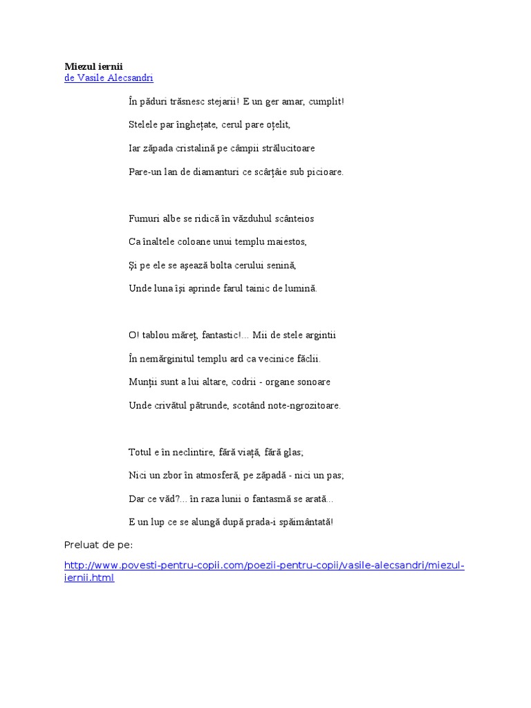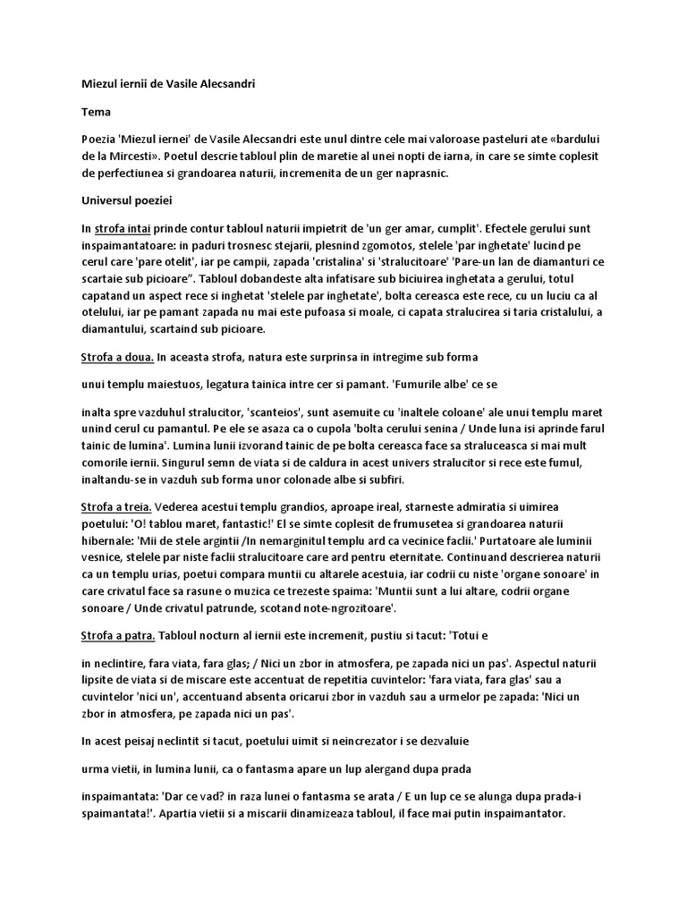 Miezul iernii de vasile alecsandri. De vasile alecsandri vasile alecsandri 2002 08 08 înscris în bibliotecă de aleksandar stoicovici. Textul mezul iernei de vasile alecsandri aparține speciei literare pastel deoarece are trăsăturile specifice acesteia. Fumuri albe se ridică în văzduhul scânteios ca înaltele coloane unui templu maiestos. Vasile alecsandri creează un tablou în versuri prin intermediul căruia ne transmite şi propriile sentimente produse de măreţia naturii.