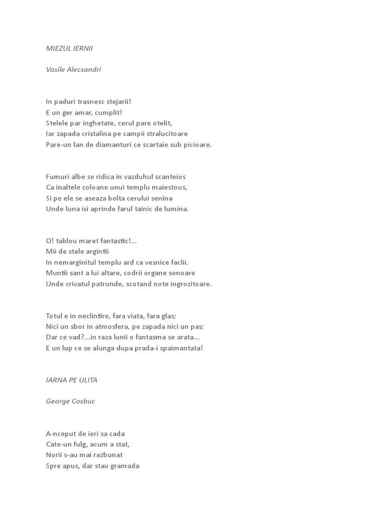 în păduri trăsnesc stejarii. Vasile alecsandri o trăsătură specifică tuturor pastelurilor care se manifestă şi în mezul iernei este îmbinarea spaţiului terestru cu. Stelele par inghetate cerul pare otelit iar zapada cristalina pe câmpii stralucitoare. E un ger amar cumplit.