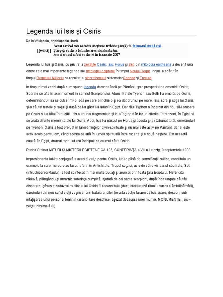 Mituri egiptene mitul lui osiris şi isis. Acest mit care în adevăr este mitul lui isis şi al lui osiris cei doi fiind un cuplu model al instituţiei regale garant al stabilităţii şi armoniei permitea iniţiaţilor să înţeleagă misterul suprem. Mitul lui isis si osiris este considerat cel mai renumit mit din mitologia egipteana. Osiris si isis osiris fiul pamantului si al cerului era fratele sotul lui isis zeita pamantului si a lunii set fratele cel rau al lui osiris si zeu al intunericului l a inchis pe osiris intr un sicriu pe care l a aruncat in nil macinata de grija isis a gasit in cele din urma sicriul pe coastele feniciene unde fusese aruncat pe pamant si ajunsese sa.