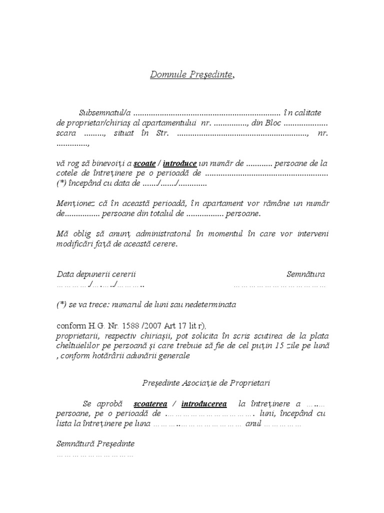 Cerere de inscriere cerere restituire fond rulment cerere scoatere introducere persoane la intretinere citire apometre. Model cerere scoatere persoane de la intretinere. Fisa de anuntare a sosirii si plecarii. Cerere de scutire la plata cheltuielilor pe persoana pentru cotele de intretinere doamna domnule presedinte subsemnatul a proprietarul apartamentului nr.