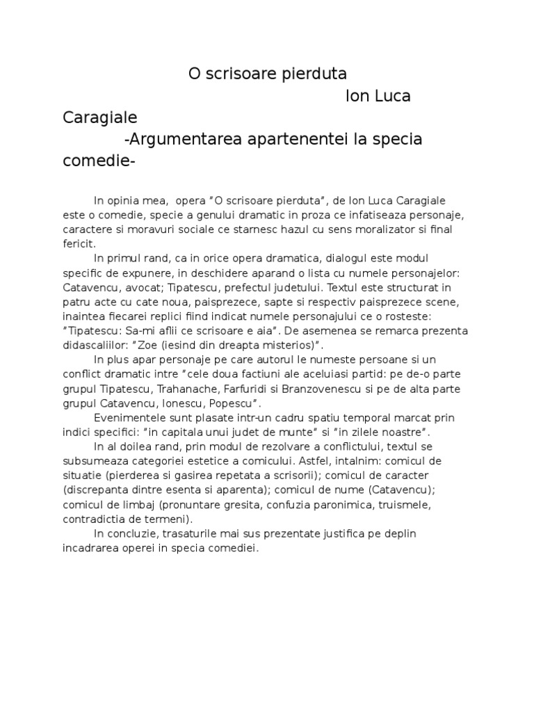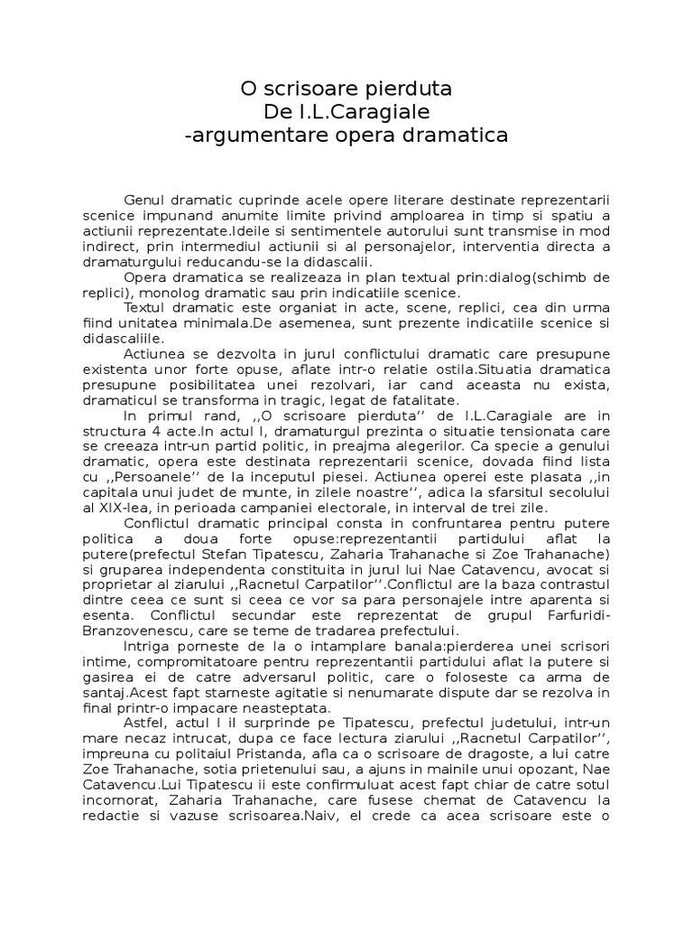 Puteti gasi foarte multe referate accesand categoriile din partea dreapta despre argumentare ca o scrisoare pierduta de ilcaragiale apartine gen dramatic. Cetateanul turmentat completeaza diversitatea tipologiilor realizate de i. El se declanseaza odata cu pierderea scrisorii de amor si evolueaza pe masura ce catavencu ii santajeaza pe adversarii sai cu publicarea ei. Argumentare ca o scrisoare pierduta de ilcaragiale apartine gen dramatic mai jos o sa aveti mai multe rezultate pentru cautarea argumentare ca o scrisoare pierduta de ilcaragiale apartine gen dramatic.