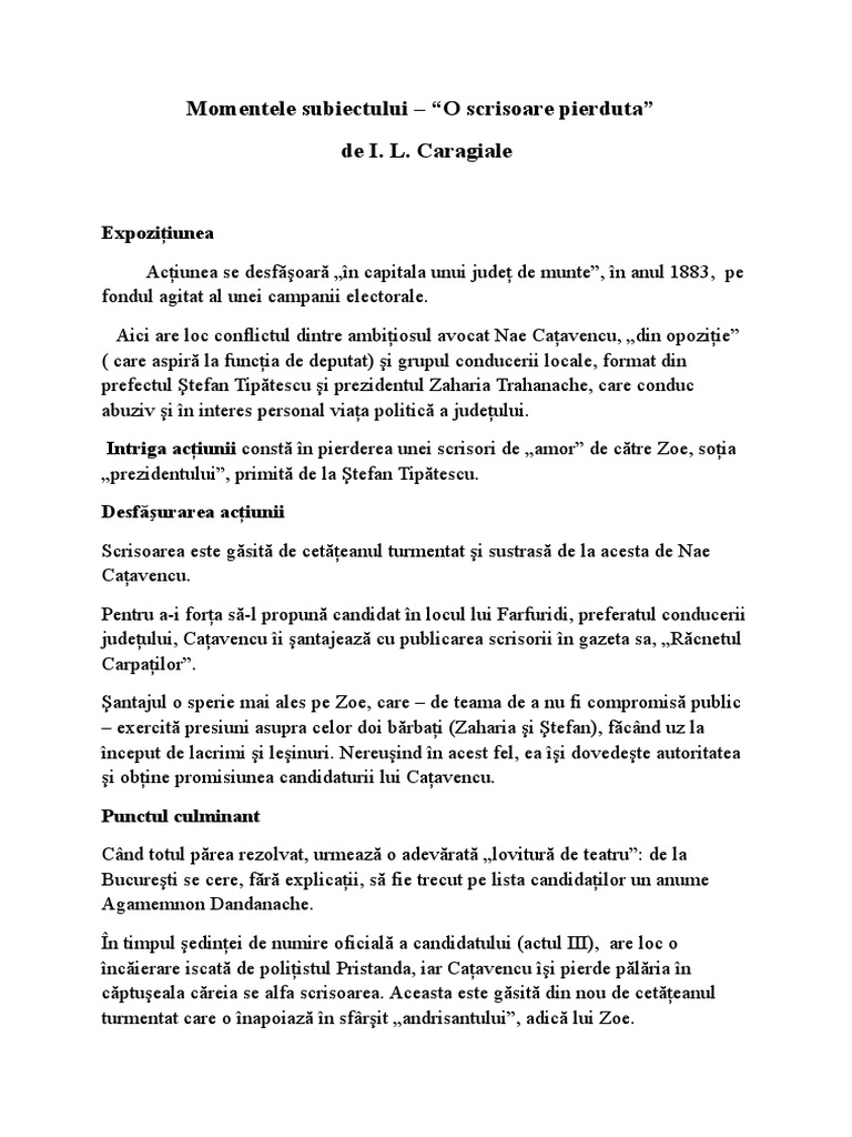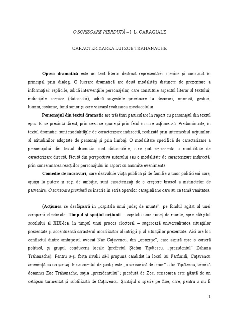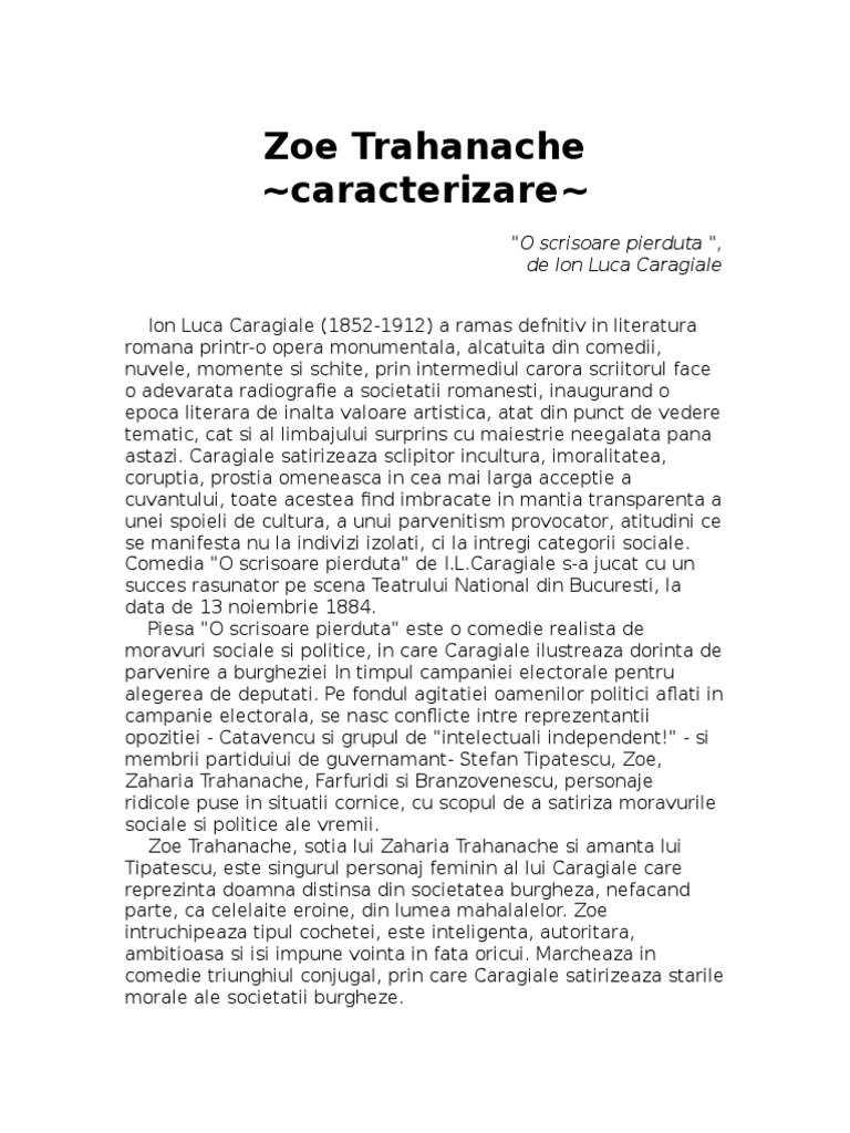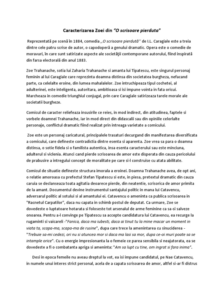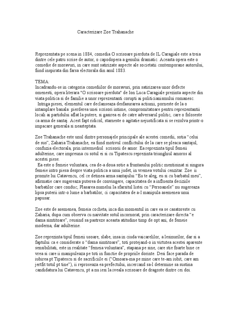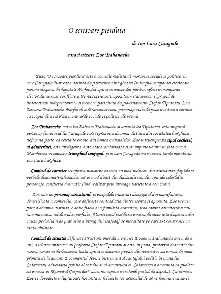 Intreaba despre o scrisoare pierduta caracterizare zoe trahanache personajul principal static unidimensional realizat cu mijloace ale comicului este singurul pesoanj feminin din comedie. Nae cațavencu schimbă tactica parvenirii flatând o pe zoe generoasă după ce își recapătă sc. Desi eugen lovinescu prezicea operei lui caragiale o scurta viata estetica deoarece era prea angrenata in realitatile vremilor respective aceasta a dainuit pana astazi si a ramas valabila vorbindu se adesea despre autorul ei ca depre un contemporan al nostru. Dupa o prima reactie de scorpie veninoasa la aflarea vestii ca scrisoarea ei fusese pierduta indata ce o reprimeste de la cetateanul turmentat zoe il iarta pe catavencu insa nu atat din bunatate cum sustine ea ci si dintr o doza de calcul.