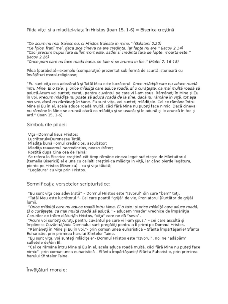 Pilda viţei si a mladiţei viaţa în hristos ioan 15 1 6 biserica creştină de acum nu mai traiesc eu ci hristos traieste in mine galateni 2 20 ce folos fratii mei daca zice cineva ca are credinta iar fapte nu are iacov 2 14.