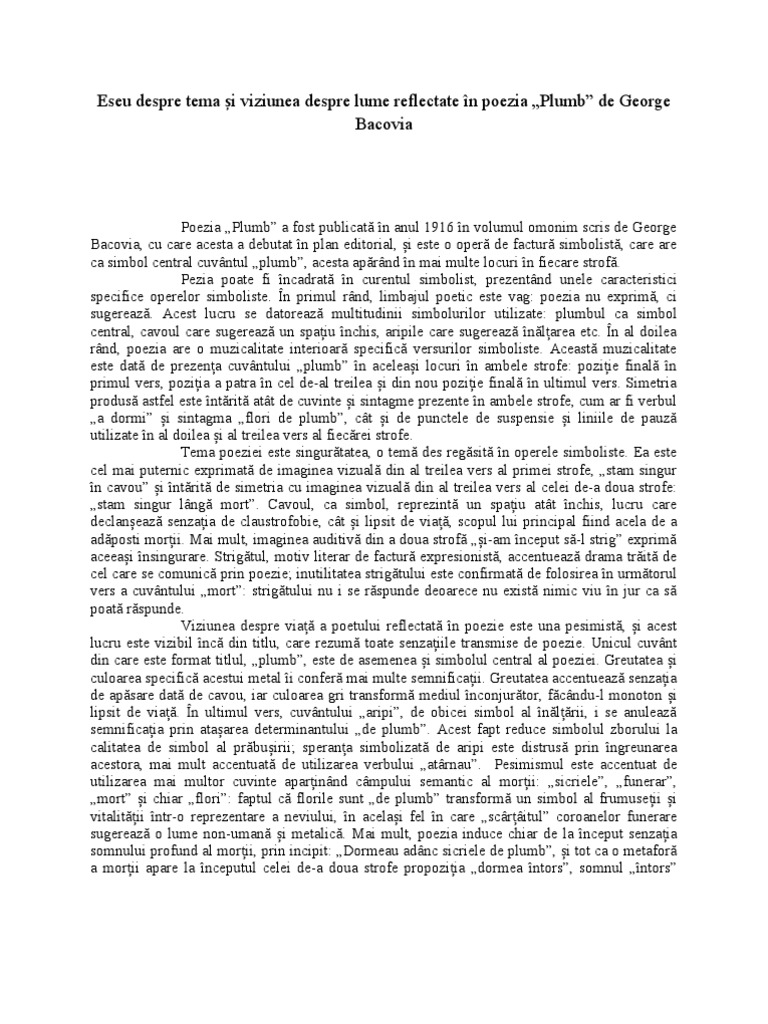 Bac eseu georgebacovia plumb romana. George bacovia plumb versuri comentariu literar analiza. Manolescu şi creează o atmosferă de plumb în care pluteşte obsesia morţii şi a neantului şi o descompunere a fiinţei organice e. Plumb de george bacovia simbolism comentariu bac.