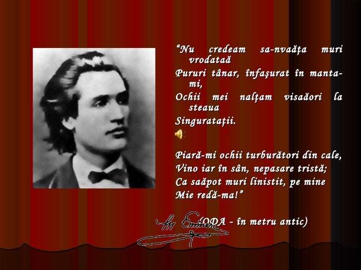 Arhiva eminescu la ceas aniversar conține câteva materiale care pot fi folosite într o activitate dedicată poetului mihai eminescu. Veți găsi aici o prezentare powerpoint cu date bibliografice însoțite de imagini versuri din creația marelui poet poezia revedere recitată de mihail sadoveanu. Vasile marius lupu 11 935 views. învăţământ gimnazial limba şi literatura român ă.