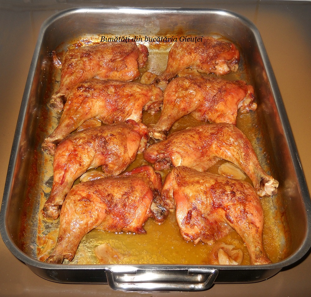 Pune pulpele cu tot cu piele intr o tigaie termorezistenta ce incape in cuptor stropeste l cu ulei de masline sare si piper apoi da tava la cuptorul preincalzit pana cand se rumeneste 50 60 minute.