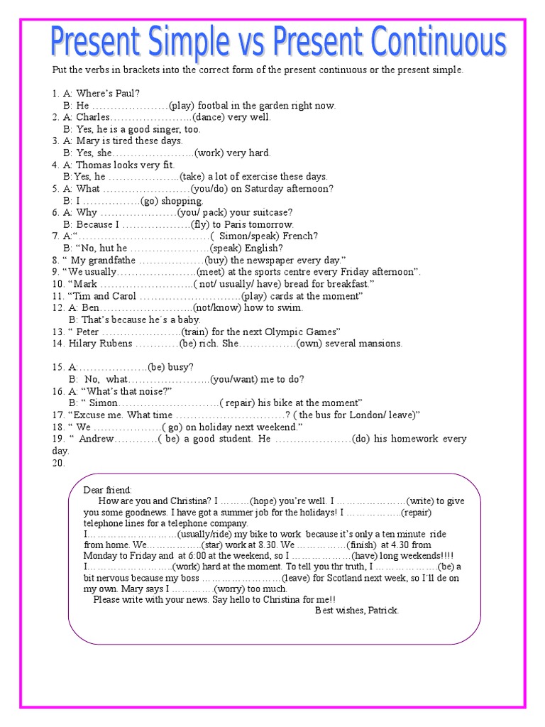 Put the verbs in brackets into the present simple or the present continuous what time. Simple present test 1 answers page 3 e put in the verbs in brackets into the gaps. Unit 3 present continuos and present simple 1 i am doing and i do exercises 3 1 are the underlined verbs right or wrong. Not to watch tv. I not like that set anyway.