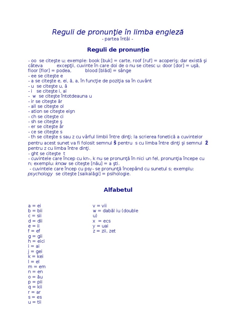 Reguli de pronuntie limba franceza. Ca sa respecte acest principiu limba franceza a creat un sistem de reguli prin care sa se asigure ca vocalele si consoanele se altereaza unele cu altele in mod repetat si in mod frecvent. Door dor uşă floor flor podea blood blăd sânge ee se citeşte e a se citeşte e ei ă a în funcţie de poziţia sa în cuvânt u se citeşte u ă. O exprimare corectă gramatical toate propoziţiile încep cu litere mari şi se termină cu semne de punctuaţie fără prescurtări de tipul nush acm adik şi fără dezacorduri flagrante.