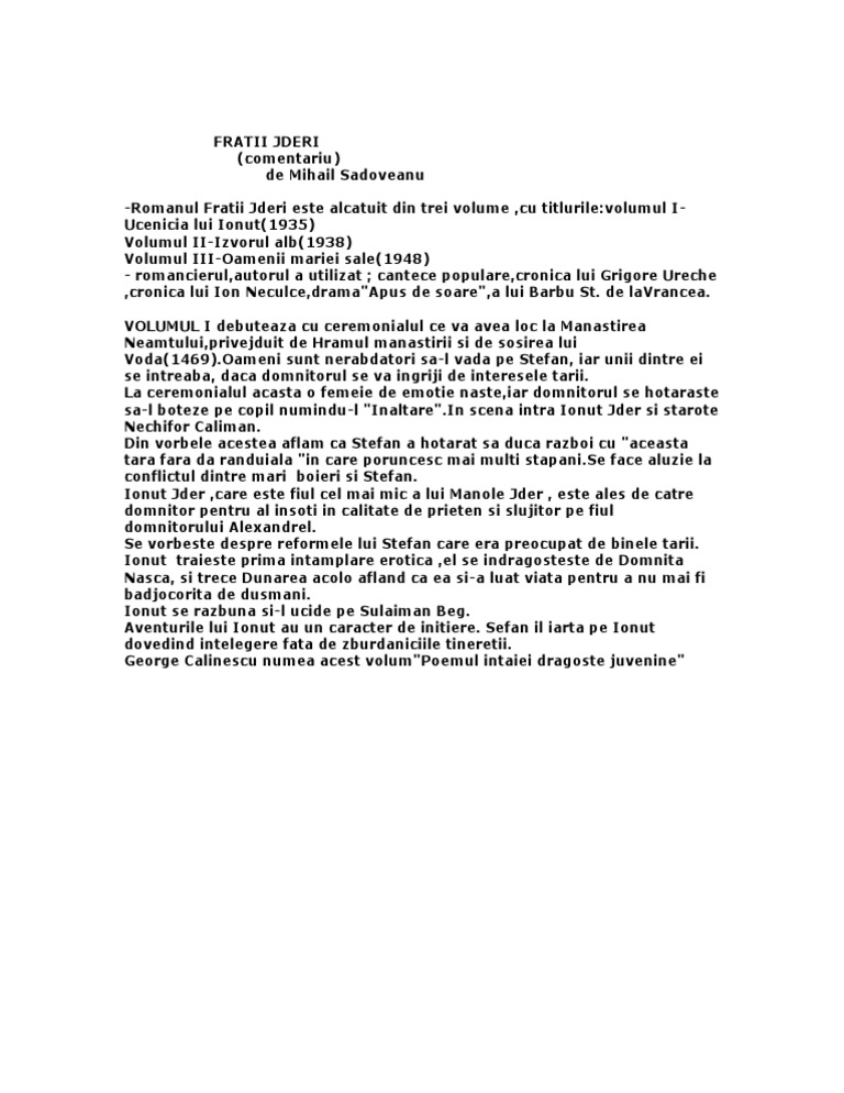 Rezumat fratii jderi volumul 1. Acest rezumat te va ajuta să îți reamintești cele mai importante secvențe ale romanului frații jderi de mihail sadoveanu iar în subcapitole vei găsi o prezentare mai amplă a fiecăreia dintre cele trei părți care compun trilogia. Fratii jderi de mihail sadoveanu vol 1. Saptamana viitoare pe 2 februarie 2011 urmeaza volumul 2 al cartii. Rezumat pe capitole la ucenicia lui ionuț volumul 1 din frații jderi rezumat scurt la ucenicia lui ionuț frații jderi ucenicia lui ionut 1935 prezinta formarea lui ionut jder fiul cel mai mic al lui manole par negru pregatirea sa in mestesugul armelor pe care l deprinde in slujba lui alexăndrel voda dorind sa si implineasca visul de a ajunge la curtea domneasca la suceava.