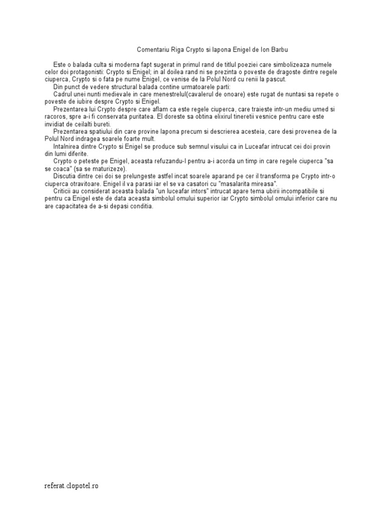 Pentru ca el nu si poate parasi lumea o imbie pe ea sa ramana ispitind o de fapt sa renunte la toate sbuciumarile sufletului uman si la idealurile ei invitatia este tentanta insa invinge constiinta umana idealul ei este soarele lumina deci cunoasterea si nu poate ramane in somn fraged si racoare si in um bra simbol al orimarii tuturor. Acesta face parte din cea de a doua etapă a creaţiei barbiene mai. Riga e bărfit și ocărât de supuși pentru că este nărăvaș și nu voia să înflorească. Portretul şi împărăţia lui crypto prezentarea locului natal al lui enigel şi oprirea ei din drum în poiana lui crypto întâlnirea celor doi chemările adresate de crypto fetei şi primele refuzuri din partea acesteia refuzul categoric al fetei şi.