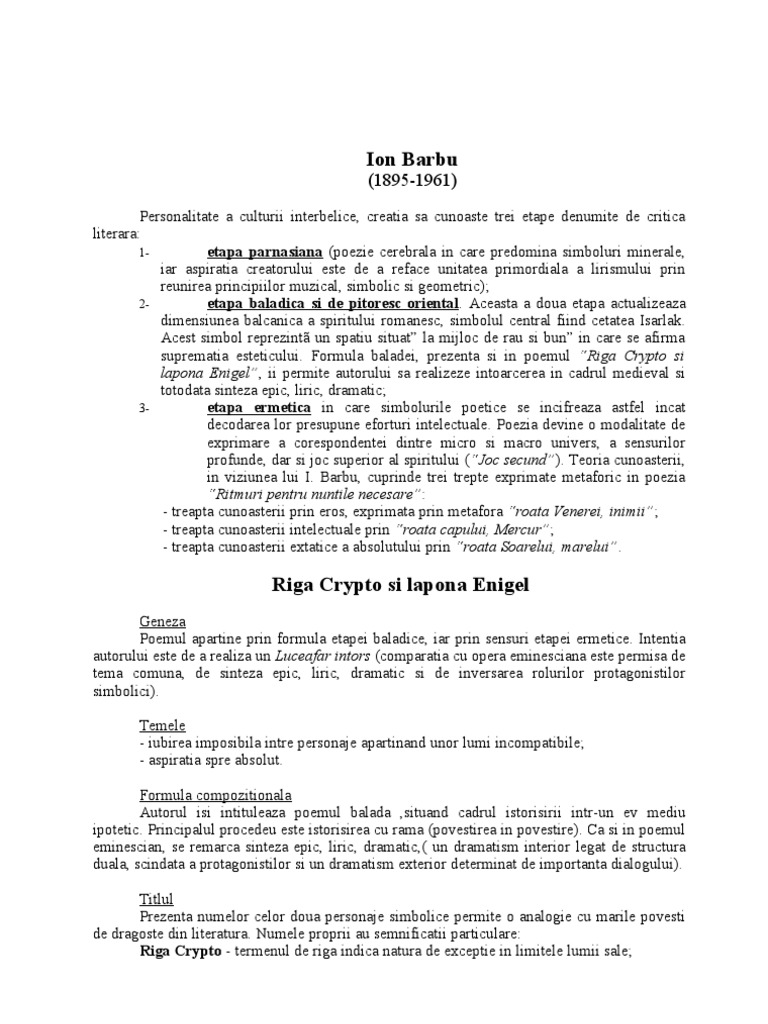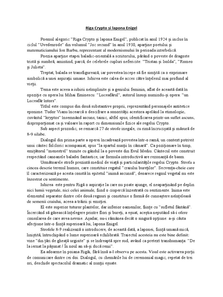 Riga crypto si lapona enigel rezumat pe scurt. Riga crypto si lapona enigel publicata inițial in 1924 integrata apoi în ciclul uvedenrode din volumul joc secund 1930 este subintitulata balada realizandu se in viziune moderna ca un amplu poem de cunoastere si poem alegoric. Riga crypto si lapona enigel ion barbu. 1 1 iunie riga crypto si lapona enigel este balada caracterizata de insusi autorul drept un luceafar intors. Partea a doua conţine povestea propriu zisă dintre riga crypto şi lapona enigel şi se constituie din mai multe secvenţe poetice.