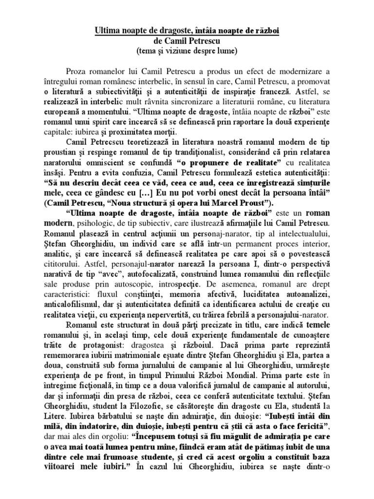 Opera literară ultima noapte de dragoste întâia noapte de război de camil petrescu este un roman modern de analiză psihologică fiind totodată şi un roman al autenticităţii şi al experienţei prin temele abordate iubirea şi războiul prin complexitatea personajelor prin concentrarea naraţiunii asupra evenimentelor vieţii interioare prin deplasarea interesului spre. Tema si viziunea despre lume ultima noapte de dragoste intaia noapte de razboi de camil petrescu. Opera literară ultima noapte de dragoste întâia noapte de război de camil petrescu a apărut în perioada interbelică 1930. Ultima noapte de dragoste intaia noapte de razboi.