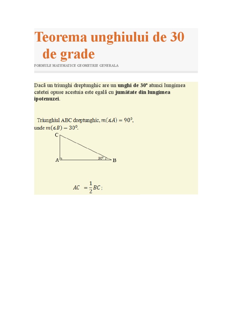 Teorema unghiului de 30 grade. Dacă un triunghi dreptunghic are un unghi de 30 o atunci lungimea catetei opuse acestuia este egală cu jumătate din lungimea ipotenuzei. Teorema unghiului de 30 de grade t30. Basme softuri educationale povesti legende mituri poezii carti audio ce pot fi cumparate din librariile online. în desenul de mai sus δabc dreptunghic în a și cum măsura unghiului c este 30 de grade putem aplica teorema unghiului de 30.