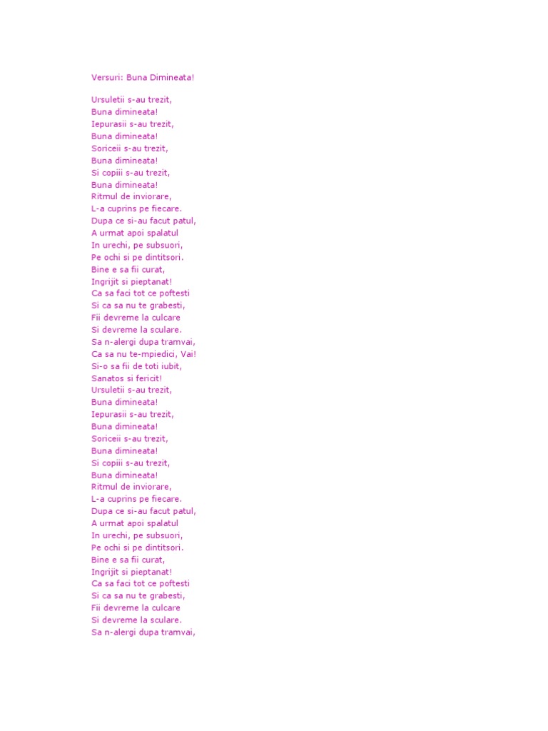Ursuletii s au trezit versuri. în urechi pe subsiori pe ochi și. Pe obraji pe ochișori pe năsuc pe dințișori. Si copii s au trezit buna dimineata. Ursuletii s au trezit buna dimineata iepurasii s au trezit buna dimineata soriceii s au trezit buna dimineata si copii s au trezit buna dimineata.